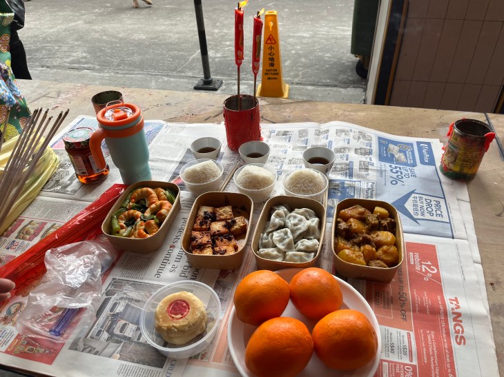 Now here is mine. I cooked this. While it’s not as fabulous as my husband’s nephew K’s vegetarian feast, my mouth did water as I was putting it down. It looked delicious and I decided to snap a picture. My sister in law would purchase praying sessions. I am more DIY, just chanting scriptures that I am familiar. I’m not that familiar. (Again, K is amazing – he knows enough to lead a home prayer session.) I’m just not so organised and in the know what and where to do these things.